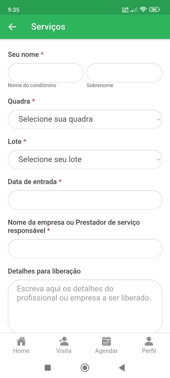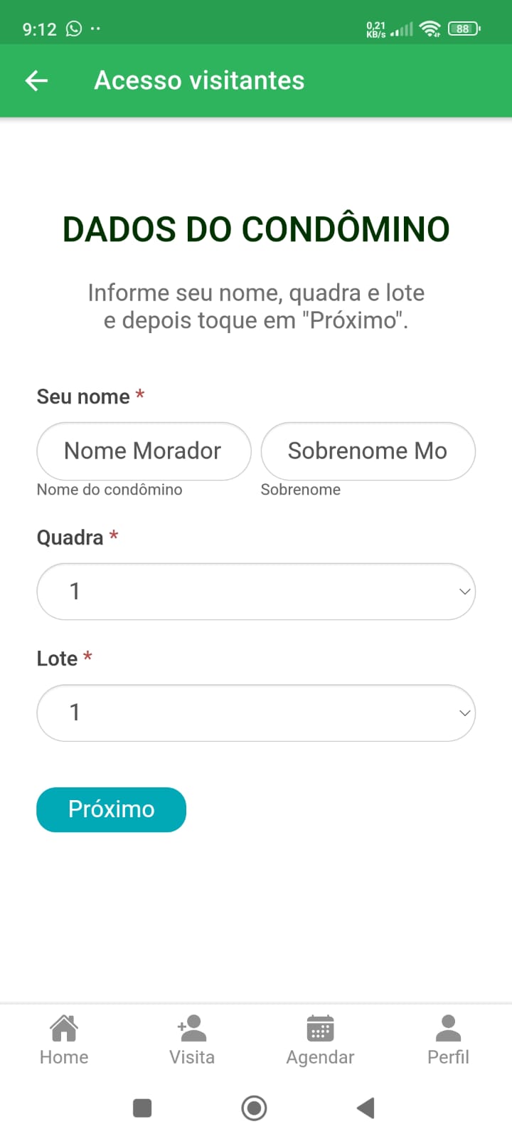 Na primeira tela informe os dados do CONDÔMINO QUE IRÁ RECEBER A VISITA (ou seja: SEU NOME, QUADRA E LOTE). Em seguida, toque em PRÓXIMO.