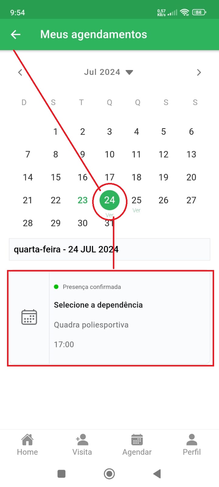Selecione o dia que você agendou (vai apercer a palavra ‘ver‘). O calendário irá exibir seus horários.