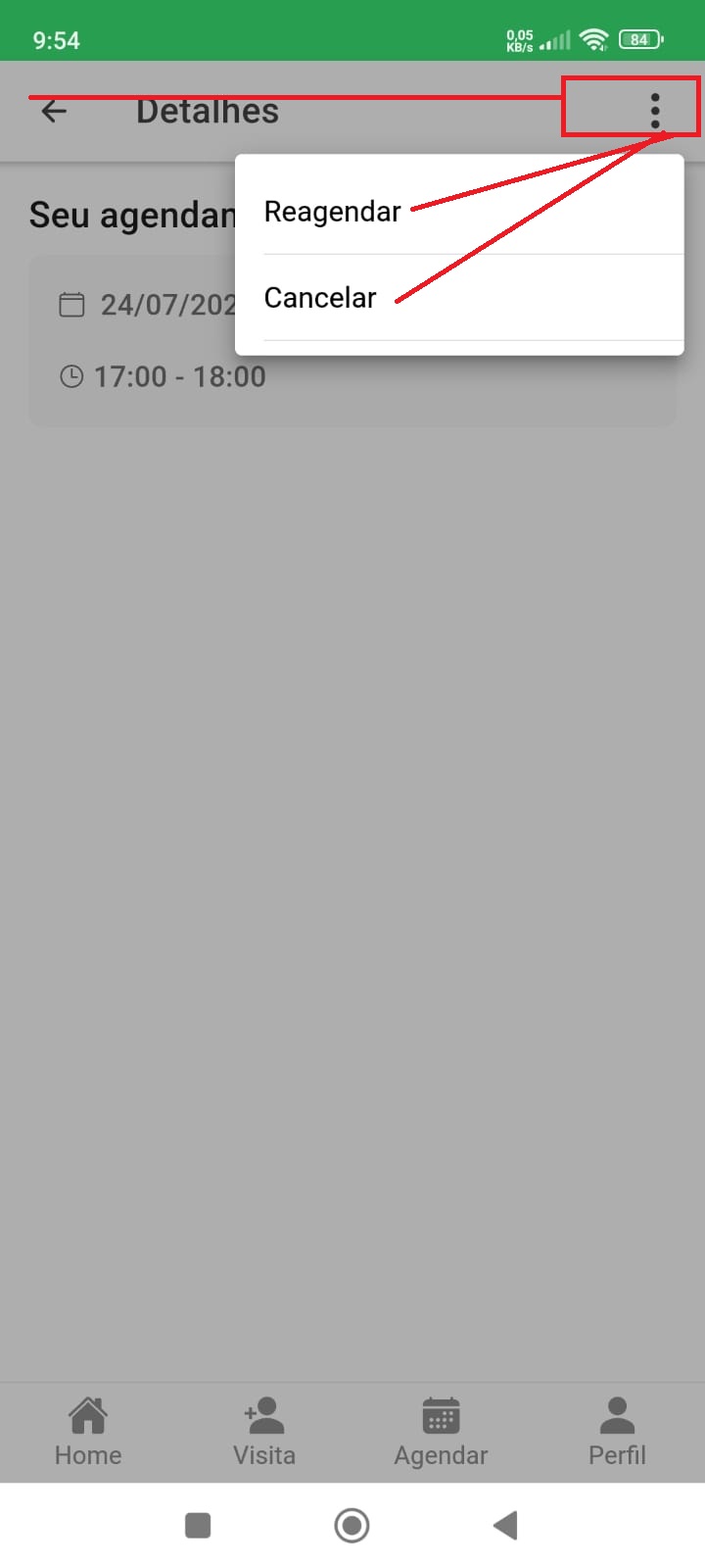 Em seguida nos 3 pontinhos e esolha entre reagendar e cancelar.